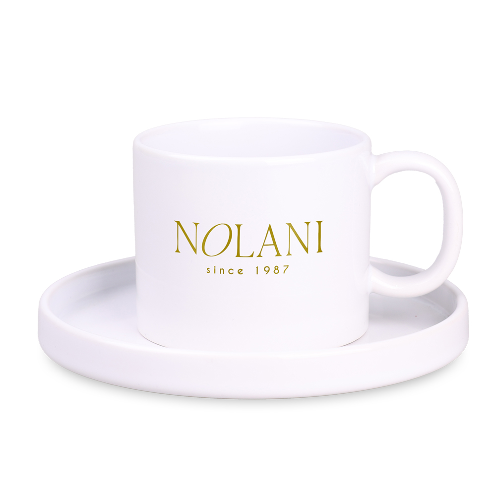 L'eleganza sta nella semplicità. Tazza Velo nella versione con piattino semplice senza incavo. Modello in ceramica dalla forma semplice e con manico ergonomico. Disponibile anche nella versione senza piattino.